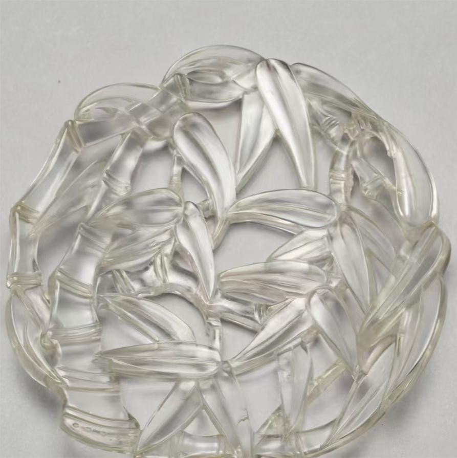 这是一枚圆形的水晶竹节佩,轻盈纤薄,透明水晶被工匠采用镂空技法,雕琢出竹枝弯垂的形态,叶片随枝蔓交错分布,疏密有致。